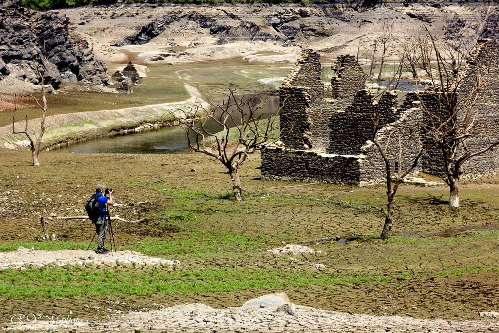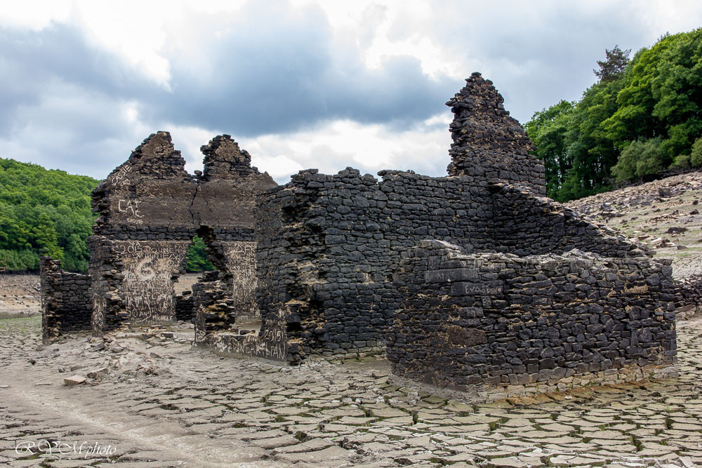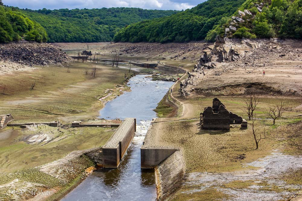 Le lac de Guerlédan, en Bretagne, a été vidé de mars à novembre 2015, laissant apparaître ses ruines englouties : maisons, écluses, ardoisières, etc.